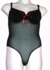 has black stretch lace ruffle accenting along the top edge of the molded bra cups and a saucy red satin ribbon accent.