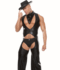 This 4 piece outfit includes wet look vest, chaps, scarf & Hat.