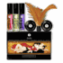 Includes: Erotic Massage Oil (Libido) .35 fl oz (10.35ml), Intimate Kisses Aphrodisiac Oil (Orgy of Grapes) .35 fl oz (10.35ml), Exotic Aroma Bathing Gel Net .35 fl oz (10.35ml), Balm Sensations (Blazing Cherry) .125 fl oz (3.70ml), Sweet Snow Body Powder (Raspberry Feeling) .125 fl oz (3.70ml), Feather.