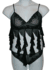 What can be said to fully describe the lovely Black Vamp Baby Doll Set? Stretch lace "cut" to look like "torn fringe" accents the Swiss-Dot like bodice. Satin embroidery adds a distinctive edge to both the top and bottom of this delightfully sexy baby doll set.